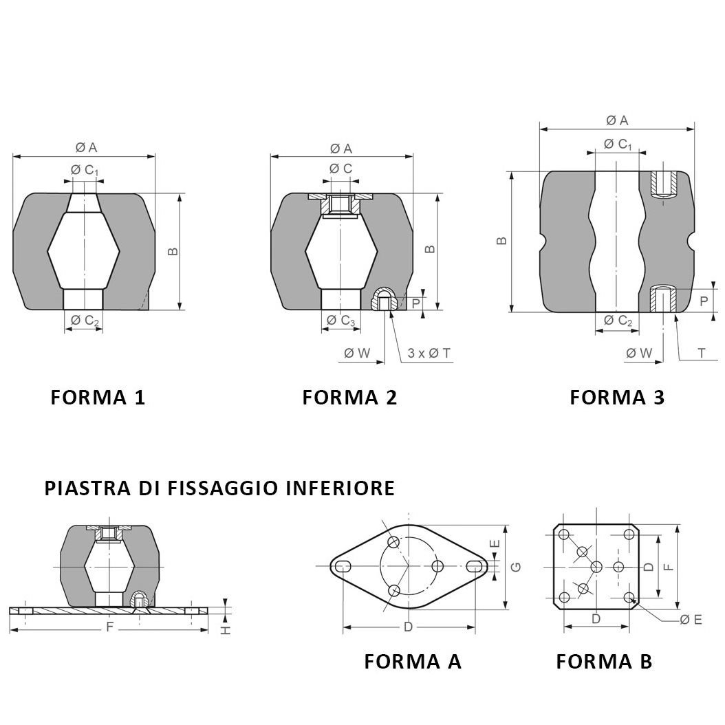 wdt_ID CODICE ARTICOLO TUTTO GOMMA FORMA CODICE ARTICOLO CON FISSAGGIO FORMA CARICO STATICO daN Ø A (mm) B (mm) C Ø C1 (mm) Ø C2 (mm) Ø C3 (mm) Ø W (mm) T P (mm)