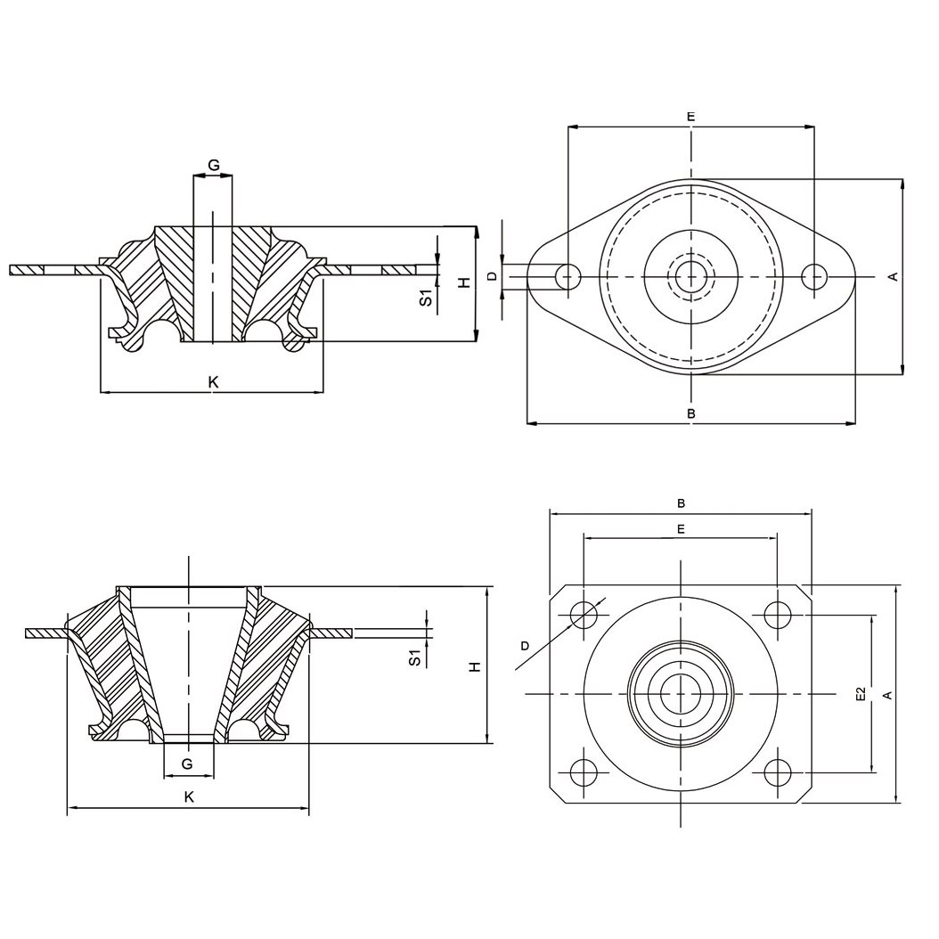 I supporti antivibranti conici sono caratterizzati da alti cedimenti assiali e limitati cedimenti radiali. Sono forniti completi di rondelle che limitano i movimenti in caso di urti. Vengono utilizzati spesso come supporti cabina, e in applicazioni mobili. A richiesta possono essere forniti anche con alcuni scarichi nella parte in elastomero per permettere cedimenti superiori.